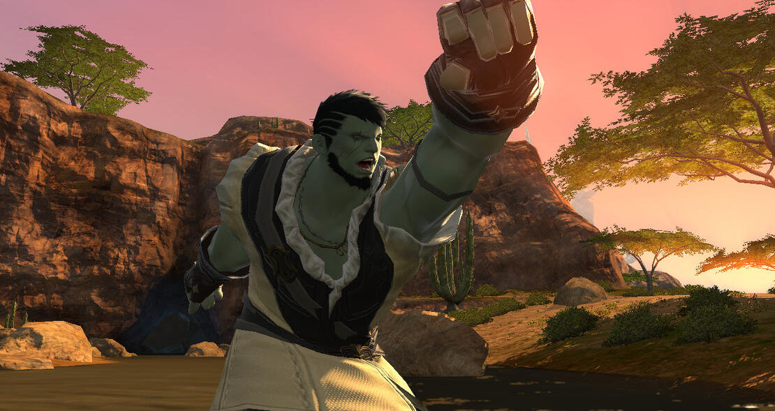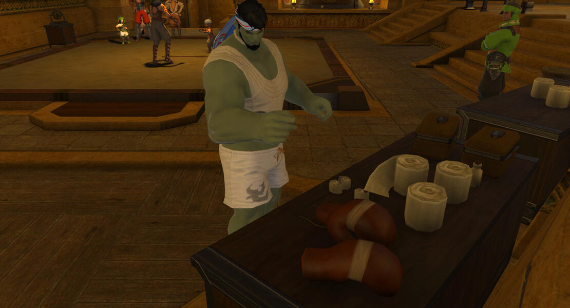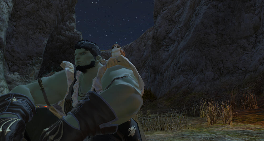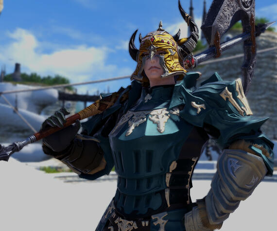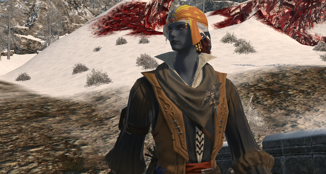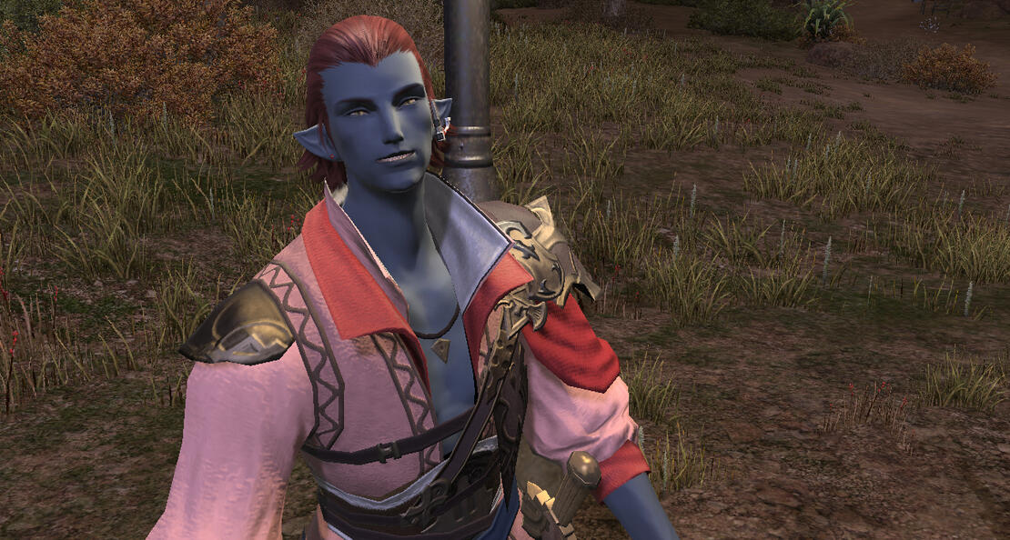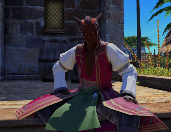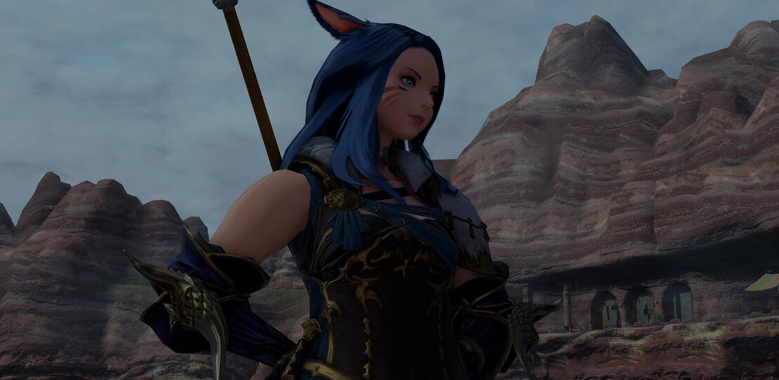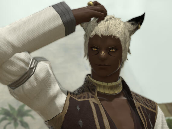 The sixth son of a sister to Matriarch Oghii Tayuun who knows his way around a war axe. Raised in the Moon Keeper tradition he saw little contact with the communities women enjoyed, rarely saw his siblings, knew little on who fathered him, and followed his male mentor like a stray. He grew to be self sufficient with independent thinking, at the cost of isolation.For lack of anything better he followed tradition year after year. He came of age and wandered alone, survived alone, visited villages to mate, produced no children, and had no lasting friends.Day after day of a routine that stuck him in a rut of mediocrity took its toll. Eventually he realized he might go mad forcing himself to continue a half life. To live in stasis was no different from death; he struck out for martial training the next day. In so doing he encountered Jeweled Eagle, a woman who gave him the gift of aspirations and sharpened his will to venture through life after her unbowed example despite many hardships.Now years with The Shroud behind him he shines leading his mercenaries from all walks of life. He minds his manners (except when he shouldn't), and leads every interaction or party with a natural cheer. If anyone were to look hard enough it'd be clear he dives into all he does to make up for lost time. Sometimes with it being more than he can chew.Despite his family's distance he does care for them, for hazy memories of days past, and time to time will inquire or send gifts; perhaps desperate for that approval he'll never have. The revelation of being the Warrior of Light's cousin shook him at first, but he's driven to know and understand her. Perhaps for once his family will reach back.